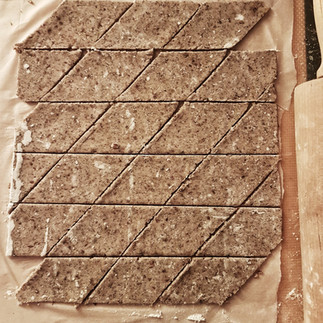 Roll out the dough on parchment paper to your desired thickness (thinner makes crunchier crackers). Score it with a knife, lightly tracing out your desired cracker size and shape. You can also use a cookie cutter for this step or simply break it up in rough pieces after baking. Lift the parchment paper into a baking tray